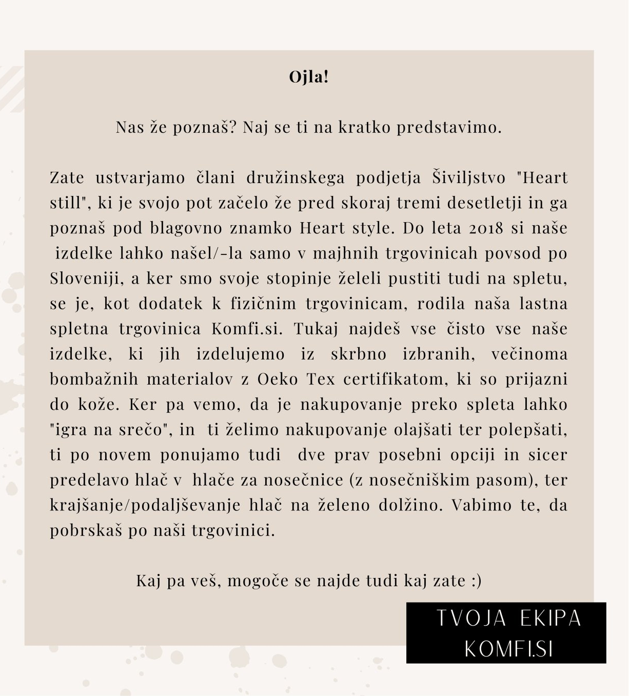 vaša uporabnica sem že, odkar se spomnim, zanesljivo pa več kot 20 let. Z vašimi izdelki me je seznanila bivša sodelavka, to je B. H. Najbrž vam njeno ime ni neznano. Nekaj let sem hlače kupovala samo pri njej, potem pa včasih tudi v trgovini Hani v Mengšu. Trgovina je zdaj že nekaj časa zaprta, z B. imam manj stikov ... In tako sem se odločila za nakup prek spleta (tokrat že drugič), čeprav se tega načina nakupovanja ne poslužujem. A vašim izdelkom zaupam, zato sem naredila izjemo. In tokrat naročila še hlače za prijateljico. Tudi ona je zelo zadovoljna z njimi.